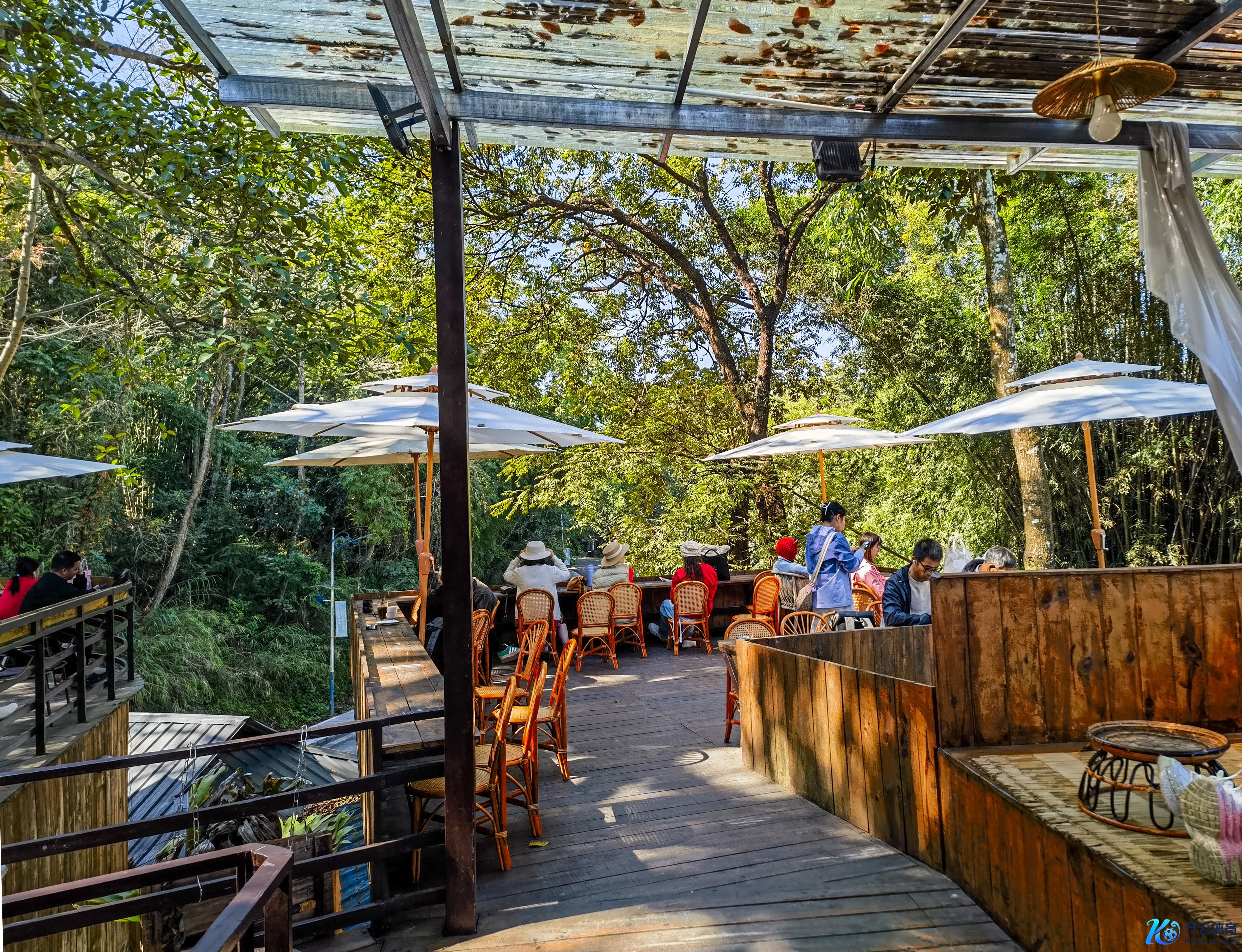 快到勐焕大金塔时,咱们觉得山上泊车已满(导航请示的),就在山下找泊车处。看到一棵大树下停着不少车,咱们也停驻来,效劳发现大树上简直有一个咖啡馆,有东说念主坐在树上边舒坦爽快地看景,这里简直是一个网红打卡点——芒市大树咖啡馆。