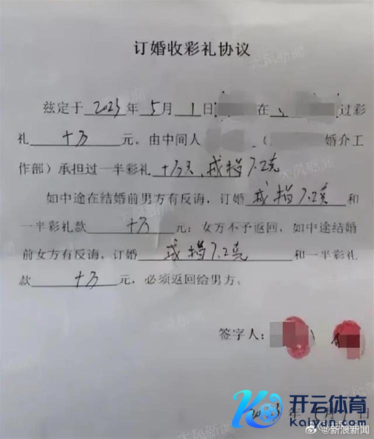 据被告东说念主母亲甄女士先容,5月1日,在中间东说念主义证下,27岁男儿和24岁女子举行订婚宴,男方给了女孩一半彩礼10万元(迎娶时付另一半)和一枚7.2克金欺压,她和丈夫还有男儿共同在字据上摁了指摹,承诺成婚一年后,面积90多平时米的婚房房产证上加上女孩名字。