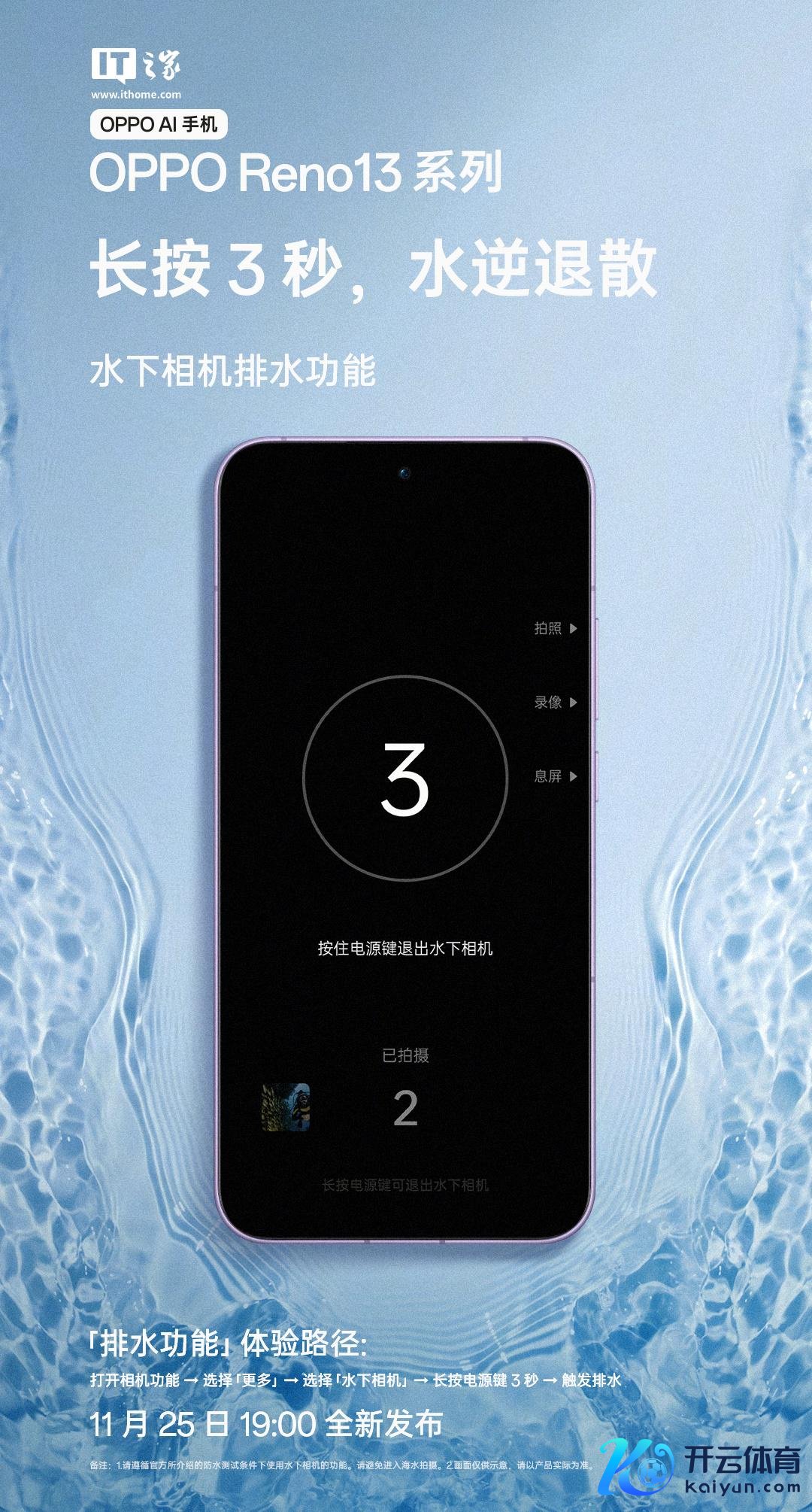 此外,OPPO Reno 13 系列手机还领有水下相机排水功能,触发旅途为:灵通相机功能 → 聘请“更多” → 聘请“水下相机” → 长按电源键 3 秒 → 触发排水。