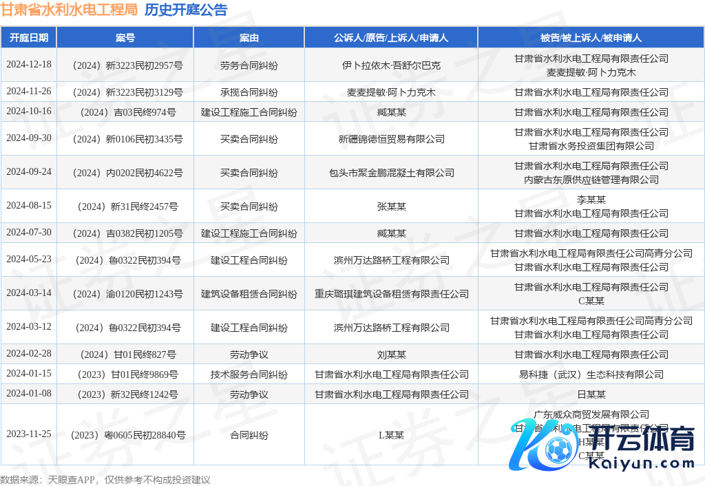 本站音问,字据天眼查APP显露,近日公布了一则甘肃省水利水电工程局有限包袱公司行为被告/被上诉东说念主的开庭公告,详备本体如下: