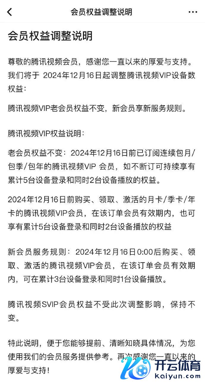 2024年12月16日0:00后购买、领取、激活的腾讯视频VIP会员,在该订单会员有用期内,可在累计3台成立登录和同期1台成立播放。