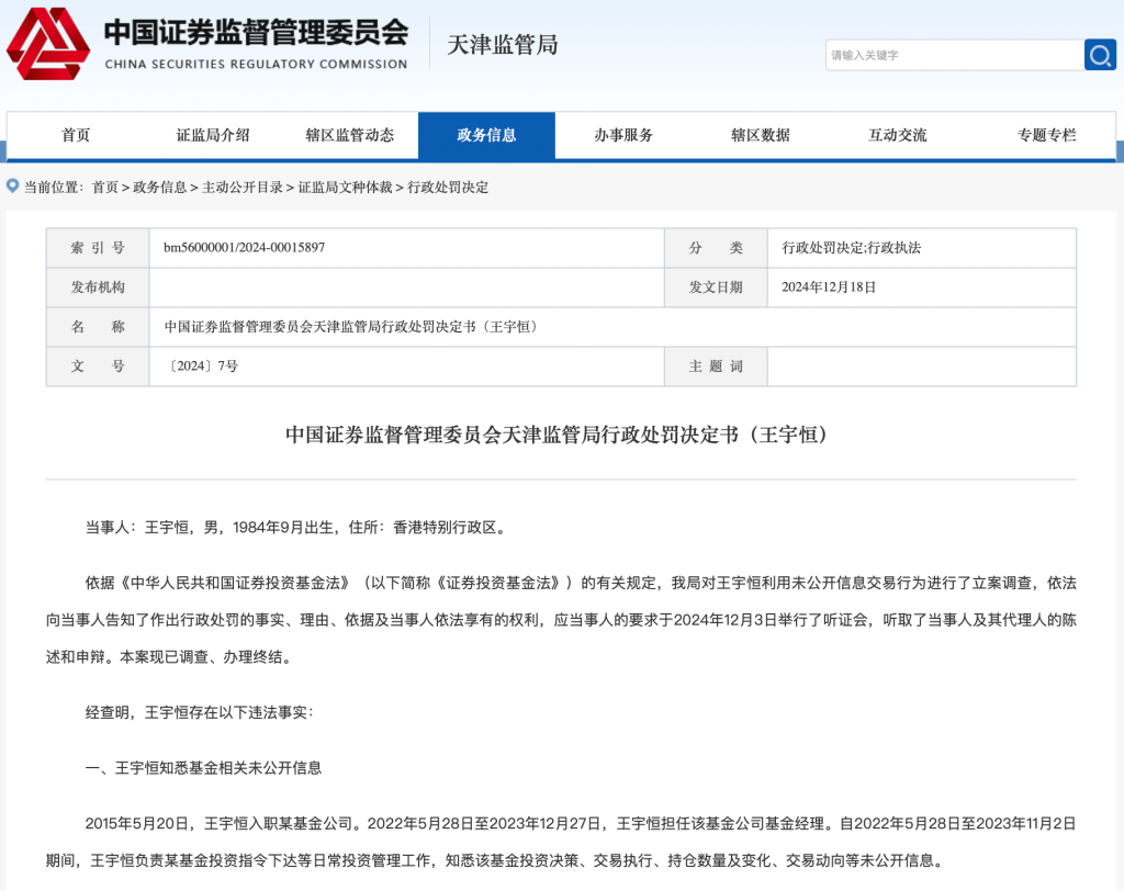 据行政处罚决定书,2015年5月20日,王宇恒入职某基金公司。2022年5月28日至2023年12月27日,王宇恒担任该基金公司基金司理。自2022年5月28日至2023年11月2日历间,王宇恒证明某基金投资请示下达等普通投资科罚使命,明察该基金投资有策画、往复实行、捏仓数目及变化、往复动向等未公开信息。