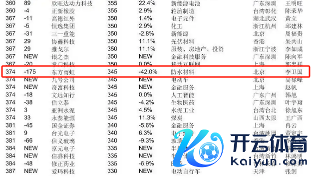 东方雨虹以市值345亿元(2024年11月15日的收盘价辩论)排行第374位。