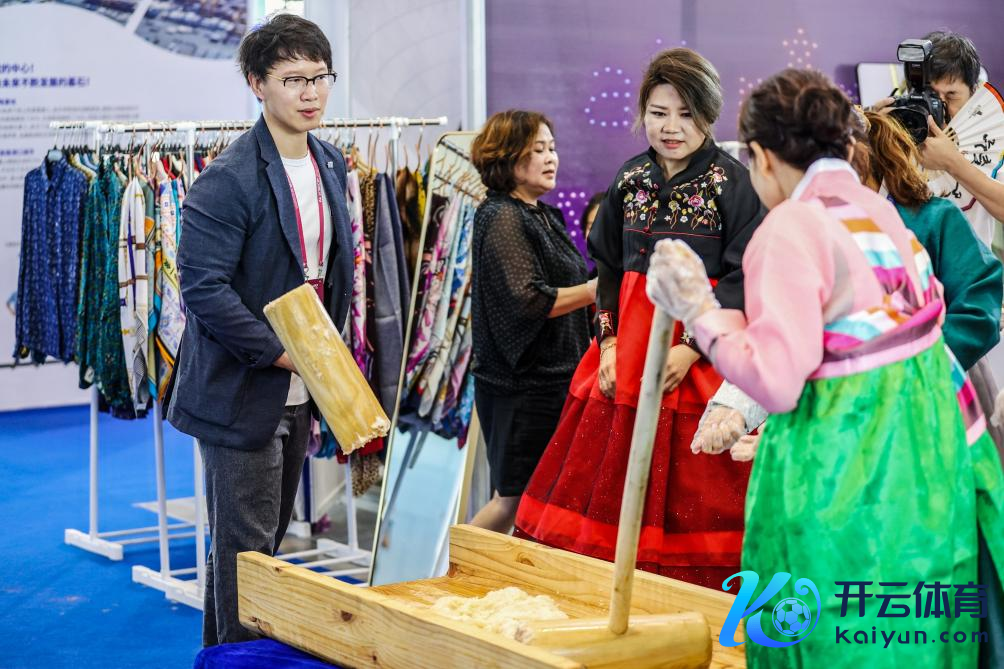 参不雅者在第三届韩国(山东)入口商品展览会体验制作年糕。新华社记者 朱峥 摄