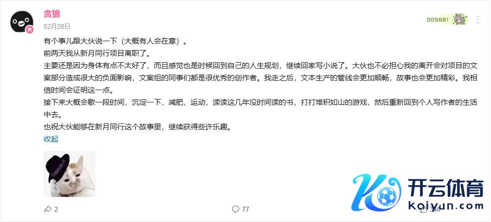 早在本年2月,《月牙同业》编缉白伯欢告示已从神情去职,他暗意,去职的主要原因是体格景色欠安,去职后将回到个东谈主写稿家身份。虽说神情组手里多半合手着后续案牍大纲,但编缉的离去,无疑仍是对这款游戏的一次千里重打击。