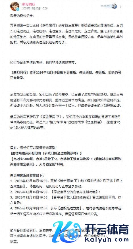 就在本日下昼16点,烛薪网罗自研的皆市超当然手游《月牙同业》厚爱官宣停更。 当今游戏已全平台关闭充值与注册进口,且神情组容许将于2025年12月30日12:00,公布属目退款处理有筹算。