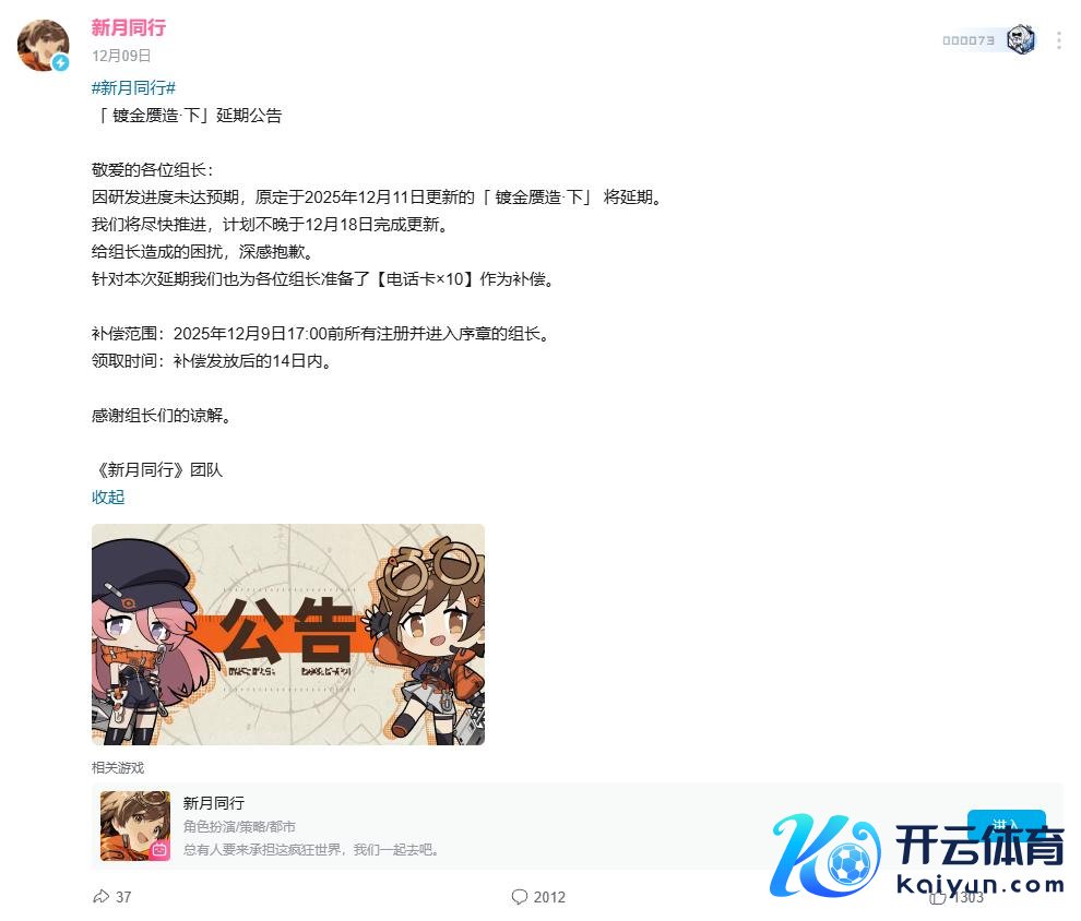 这么的效果,在玩家眼里其实早有线索——二游赛谈卷得飞起,中小厂商居品停服,停更什么的已是家常便饭;再加上官方12月9日那份版块宽限公告,公共心里些许皆打好了防患针。可当停更公告真砸下来时,好多玩家照旧忍不住一声叹气。