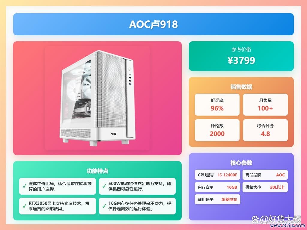 AOC这款“的卢918”台式机,i5处理器加上RTX 3050显卡,竖立平衡,挺合适游戏玩家或者需要图形处理的一又友。并且,它还有可以的膨大性,以后升级也浅易。