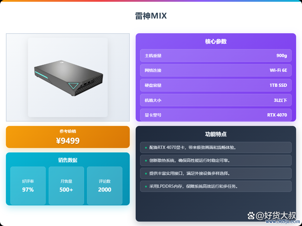 雷神MIX迷你主机,工整的机身里赋存着纷乱的性能,搭载第13代酷睿i9-13900H处理器,多任务处理不在话下。勾通上32G的内存和1TB的固态硬盘,不管是责任还是文娱,齐能给你带来速即的速率体验。