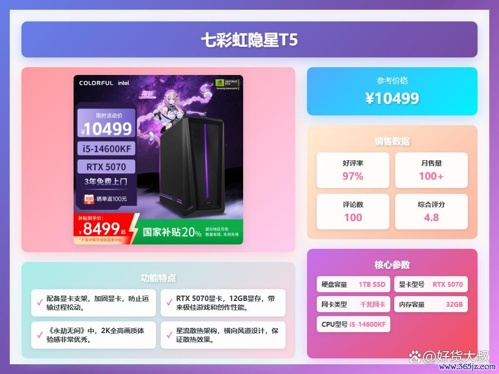这款七彩虹隐星T5电竞主机,用的是i5-14600KF处理器,搭配32GB DDR5 6000MHz高频内存,速率方面有保险。再勾通1TB NVMe M.2 SSD,不管是游戏加载还是文献传输,速率齐很快,告别卡顿!