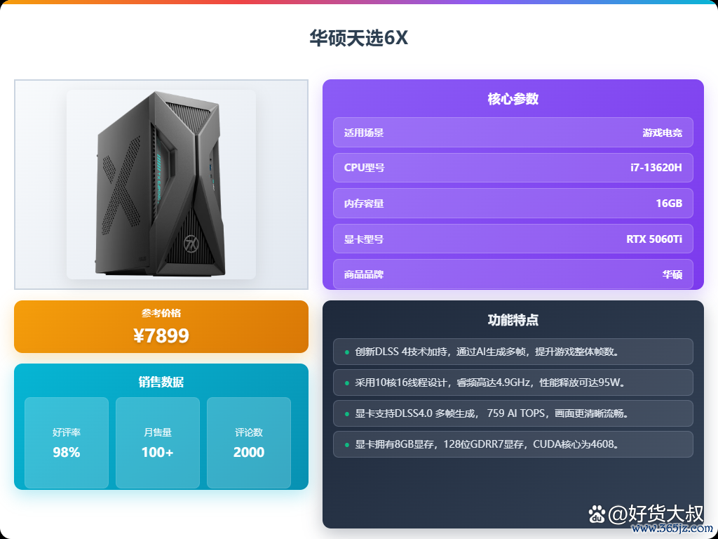 华硕天选6X这台机子,性能是真没话说!搭载了第13代酷睿i7-13620H处理器,10核16线程,睿频能到4.9GHz,不管你是要处理大型责任负载,还是玩游戏,齐能讲理粗俗。
