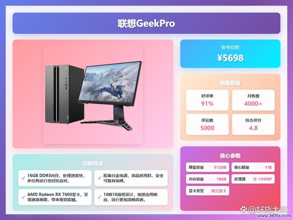 联思这款GeekPro台式机,用的是英特尔酷睿i5-14400F处理器,这颗芯采纳Intel 7工艺,10核16线程,睿频能到4.7GHz,还有20MB L3缓存,关于追求效力和游戏体验的玩家来说,应该挺过劲。