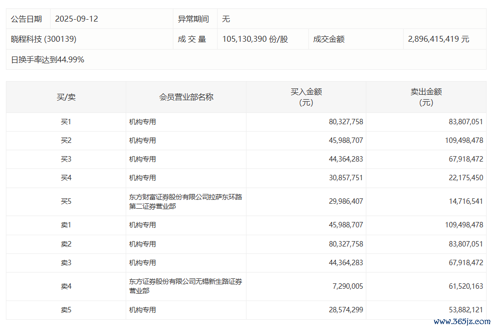 0 09-15 17:22晓程科技本日涨3.65%,有4家机构专用席位净卖出1.16亿元