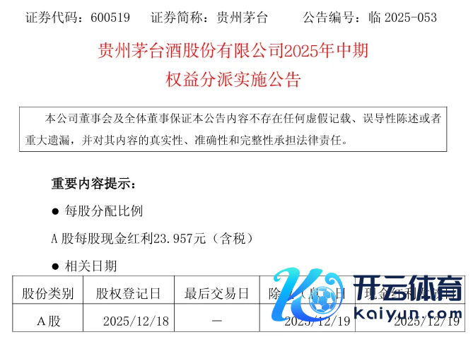 贵州茅台(600519)2025年12月10日晚间则公告,公司2025年中期利润分配有野心已获鞭策大理会过,将以总股本12.52亿股为基数,每股派发23.957元现款红利(含税),共计派发300.01亿元(含税)。股权登记日为2025年12月18日,除权(息)日和现款红利披发日均为2025年12月19日。本次分配对象为:铁心股权登记日下昼上海证券来去所收市后,在中国证券登记结算有限拖累公司上海分公司登记在册的公司整体鞭策。