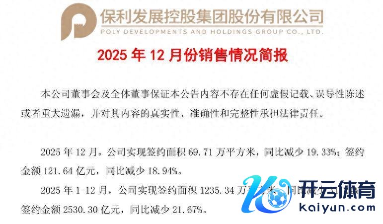 1月9日,保利发展(600048)公告2025年12月份销售情况。2025年12月欧洲杯体育,公司达成签约面积69.71万平时米,同比减少19.33%;签约金额121.64亿元,同比减少18.94%。