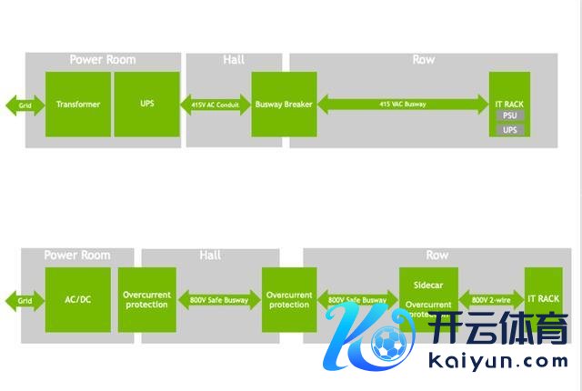 图丨现时数据中心供电架构(上)与 NVIDIA 800 VDC 架构对比(下)(着手:NVIDIA)