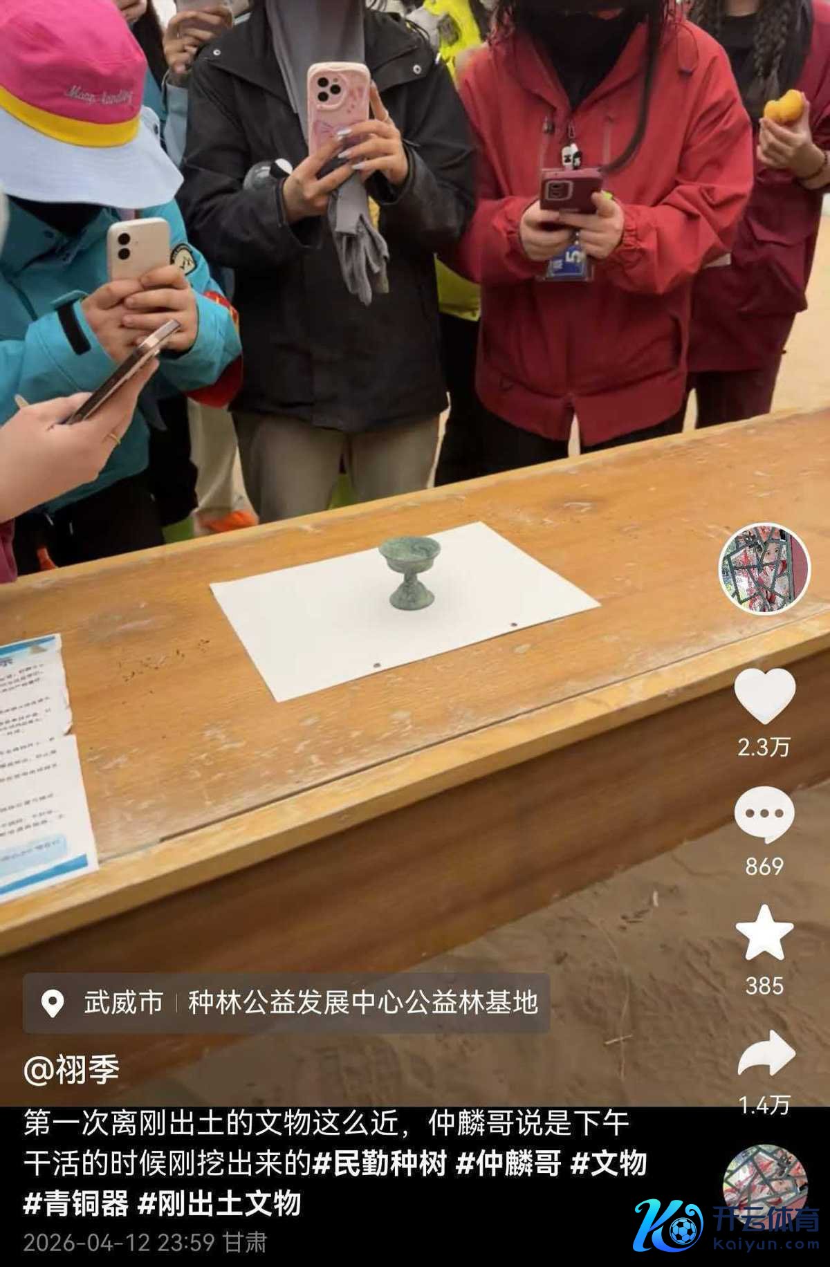 据位于民勤县腾格里沙漠边际的仲麟生态公益林基地使命主谈主员先容,前几天确乎有一个外地前来治沙的女子种树时,挖到了一个青铜色高脚杯,武威在古代叫西凉,有出土文物的可能,基地已向文旅部门陈说,然则否为文物,有待关系部门进一步拜谒漂荡。