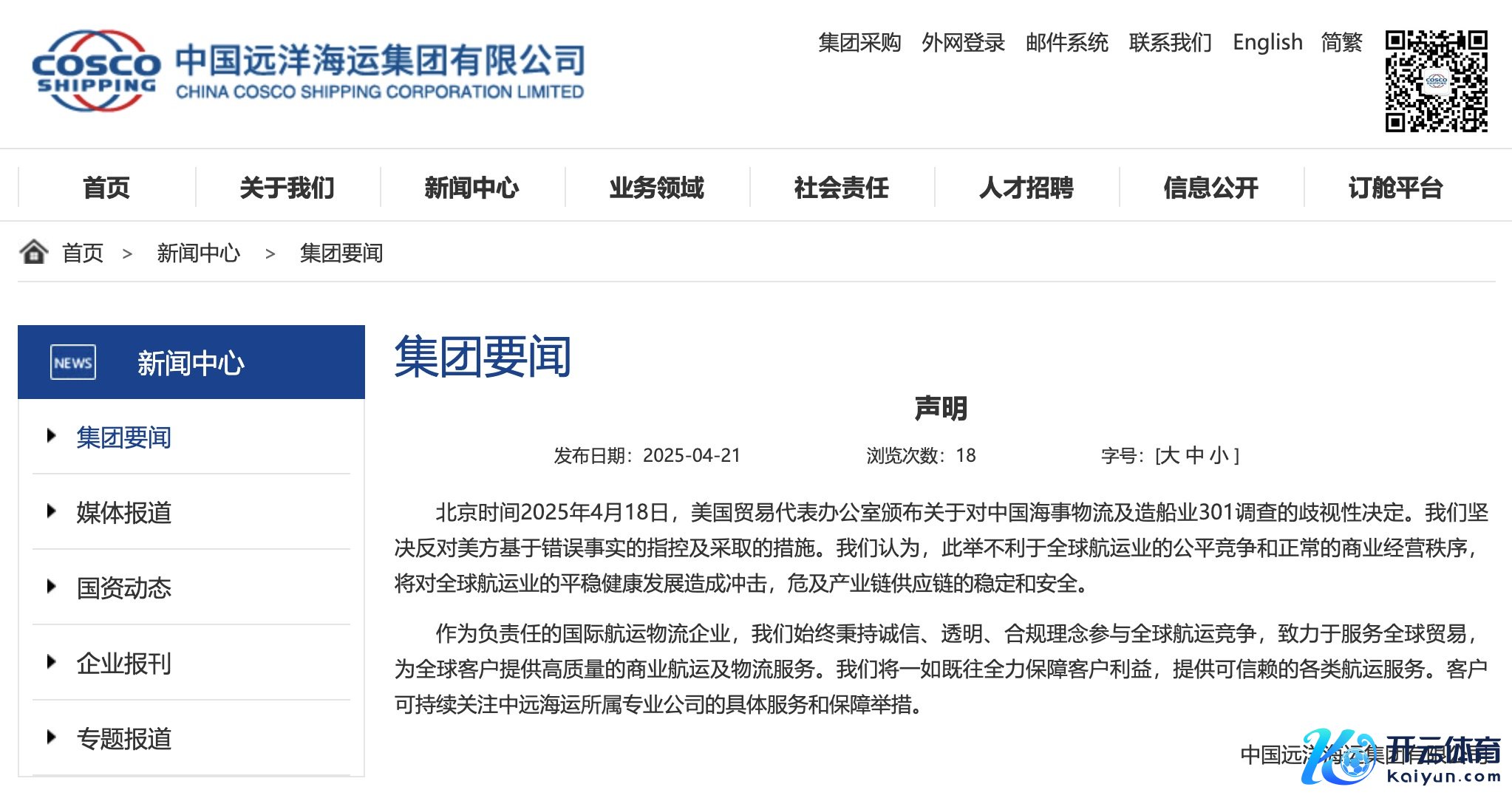 中远海运声明:顽强反对好意思方对中国海事物流及造船业301考察的脑怒性决定开云体育中远海运声明:顽强反对好意思方对中国海事物流及造船业301考察的脑怒性决定