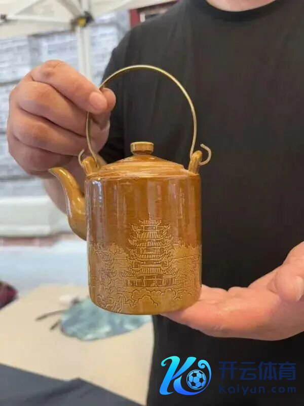 湖畔陶野马口窑责任室主持东说念主刘双的摊位上,一个绘有黄鹤楼图案的茶壶诱惑了不少搭客。